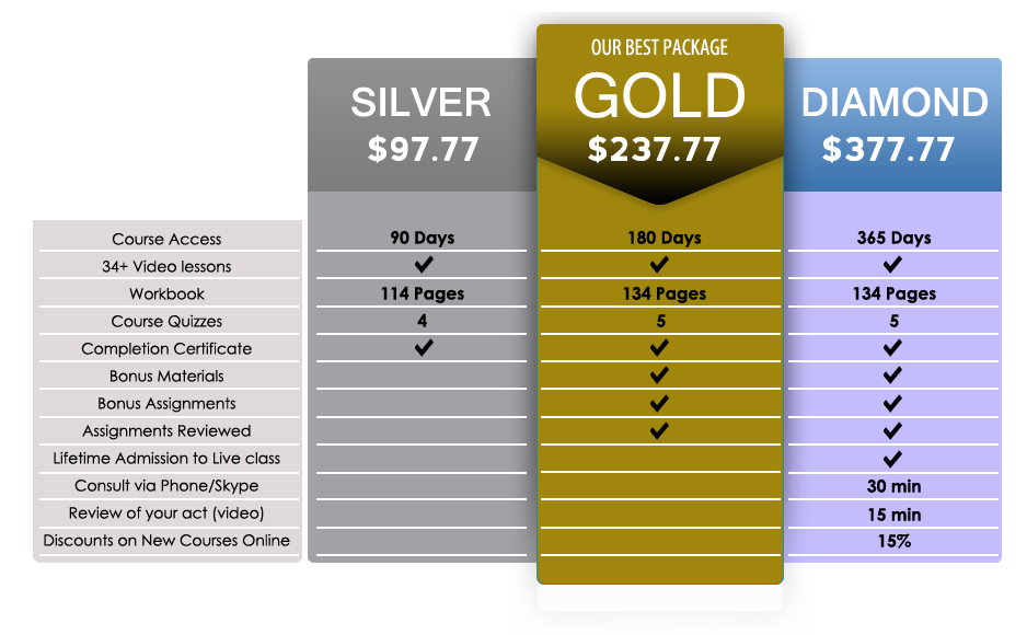 The material is organized to take you step-by-step through the joke writing process. The average first-time student develops a minimum of 8-10 minutes of stage-ready material the first time through. You’ll have access to the course for 90 days and can go through it as many times as you like within that time period. If at the end of the 90 days you wish to upgrade to the Gold package you will only need to pay the difference and the clock restarts with the new features.