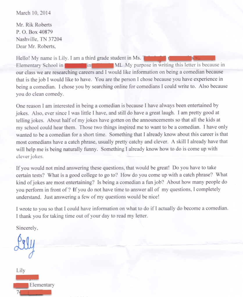 Thanks for your awesome letter. I really enjoyed it and can tell you have a great sense of humor. I can’t believe that kids are getting into stand-up comedy early, like you! It is awesome.